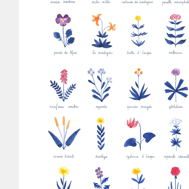 Petite collection de fleurs de montagne stylisées, peintes avec amour.